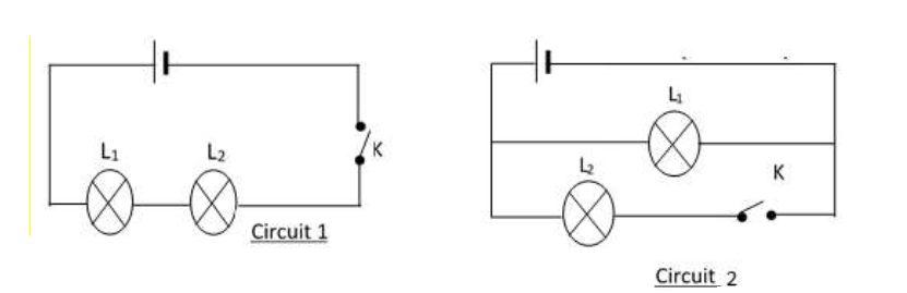 1) Le circuit étant à chaque fois fermé, explique ce qui se passe pour chacun des deux montages si le filament d'une lampe se détériore.