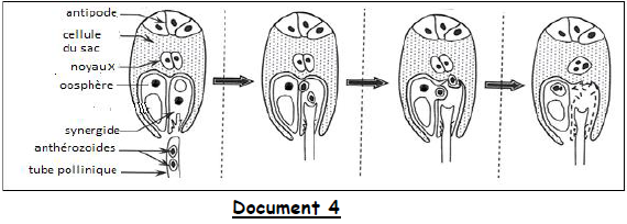 C) Le document 4 montre les étapes chronologiques du phénomène physiologique qui se déroule dans le sac embryonnaire après le dépôt des anthérozoïdes par le tube pollinique.