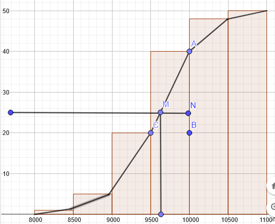 Pour obtenir la valeur exacte de la médiane M_e , on utilise une méthode par le calcul par exemple celle utilisant Thalès : on nomme les triangles ABC et AMN.