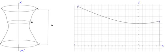 Son volume peut etre considéré comme le volume du solide de révolution engendré par la rotation de la courbe de la fonction $f$ , définie par $f(x) = 12 × \sqrt{1 +\dfrac{x^{2}}{576}}$ définie sur$ ⌈−36; 12⌉ $, autour de l’axe des abscisses dans le repère orthonormé $(O; \vec{i},\vec{j})$, unite; $2cm$