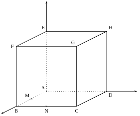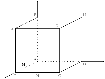 Dans le cube $ABCOEFGH$ ci-dessous et reproduit en ANNEXE $2$ à rendre avec la copie,on a placé les points $M$ et $N$ milieux respectifs des segments $[AB]$ et $[BC]$