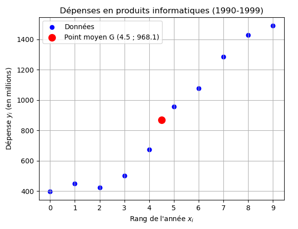 Équation : \( y - \bar{y} = \dfrac{\sigma_{xy}}{\sigma_x^2}(x - \bar{x}) \)