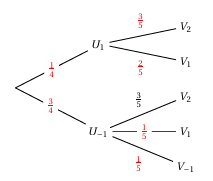 $\begin{array}{rcl} P(A)&=&P\left(U_{-1}\cap V_{-1}\right)\\&=&P\left(U_{-1}\right)\times P_{U-1}\left(V_{-1}\right)\\&=&\dfrac{3}{4}\times \dfrac{1}{5}\\&=&\dfrac{3}{20}\\&=&\dfrac{15}{100}\\&=&0.15 \end{array}$