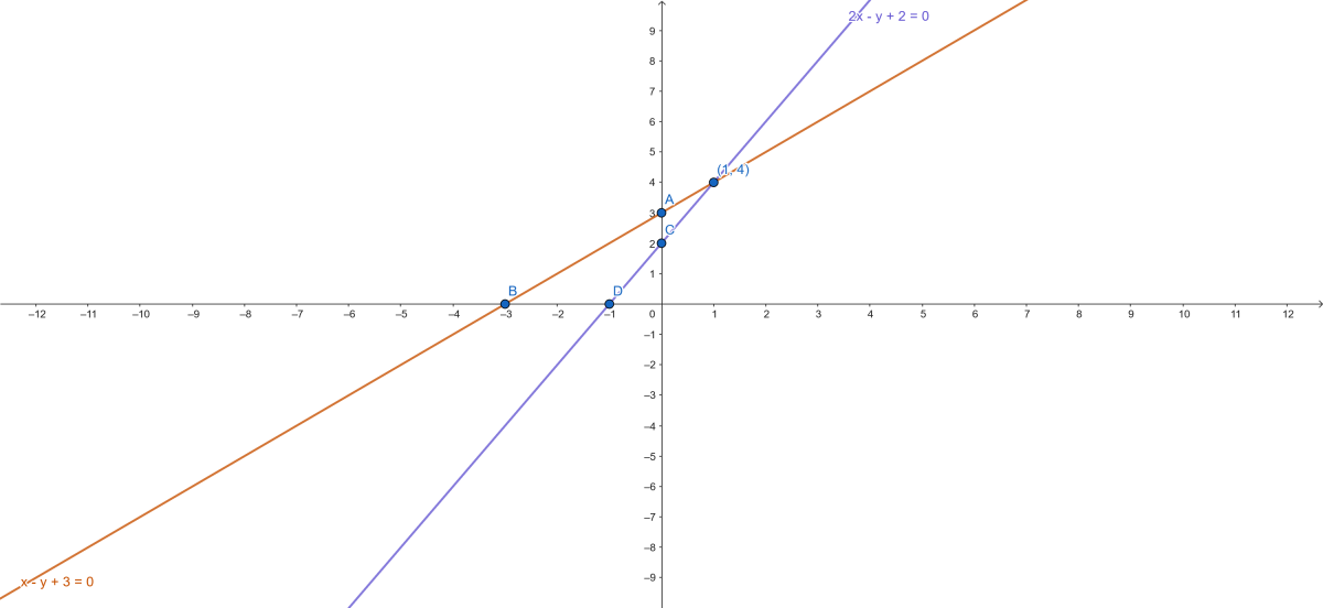 2. Solution graphique : Les droites se coupent en \( (1, 4) \).