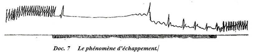 $-\ $ Lorsque le cœur est stimulé avec une fréquence élevée, il s'arrête pendant un moment puis continue à battre malgré la persistance des stimulations : c'est le phénomène d'échappement.