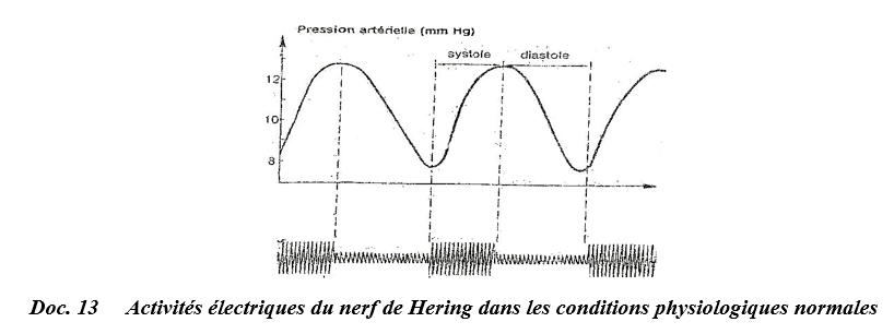 Une élévation de la pression artérielle se traduit par un influx nerveux excitateur qui est cheminé par les nerfs sino-aortiques jusqu'au noyau sensitif du $X.$