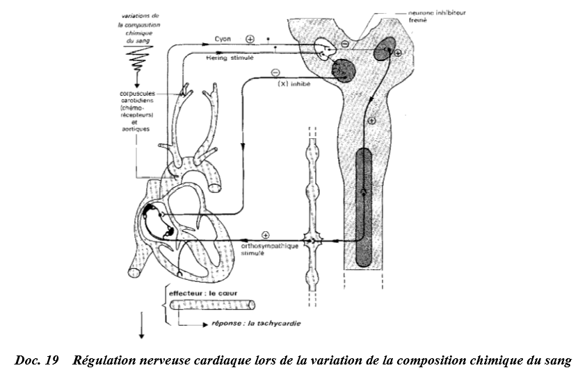 Les chémorécepteurs sont alertés et accélèrent par voie réflexe la fréquence cardiaque en inhibant le parasympathique et en excitant l'orthosympathique.