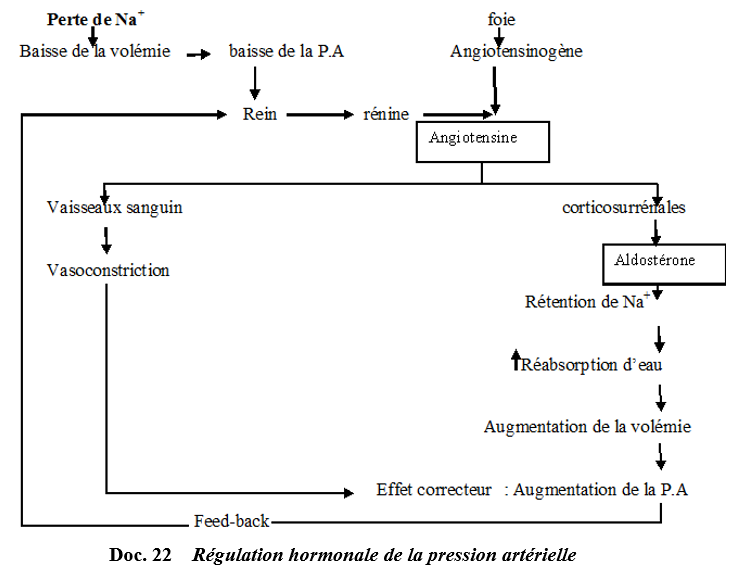 (Point de départ : baisse de la P.A due à une baisse de la volémie)