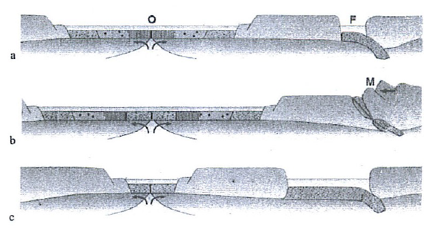 Le schéma ci-dessous montre trois phases présentées dans le désordre (a, b et c) d'un processus qui se déroule au niveau d'une dorsale.