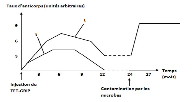 En effet, $12$ mois après l'injection du $TET-GRIP$, le taux d'anticorps antigrippaux $(g)$ s'est annulé. Donc, la durée d'action du vaccin contre la grippe est de un an $(12$ mois$).$
