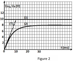 Dans une seconde expérience, on visualise, sur l'écran d'un oscilloscope bicourbe à mémoire, la tension $UR$ aux bornes du conducteur ohmique $(D)$ sur la voie $1$ et $U_{PQ}$ aux bornes du générateur sur la voie $2$ (courbes $1$ et $2$ de la figure $2$).