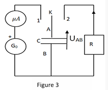 3.1. A la date $t=0$, le condensateur étant entièrement déchargé, on place $K$ en position $1$, le microampèremètre indique alors une valeur constante $I_{0}=10\,\mu A$
