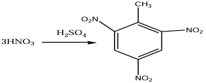 $C_{6}H_{6}+3HNO_{3}\longrightarrow^{\lim\limits H_{2}SO_{4}}C_{6}H_{3}\left(NO_{2}\right)_{3}+3H_{2}O$
