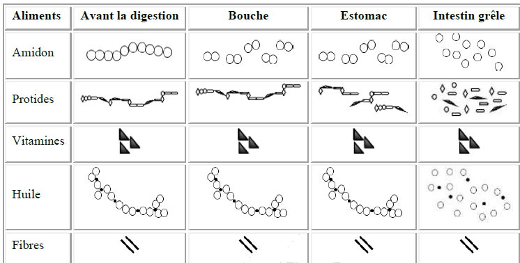 Le tableau ci-dessous présente les transformations subies par certains aliments le long du tube digestif sous l'action des enzymes des sucs digestifs.