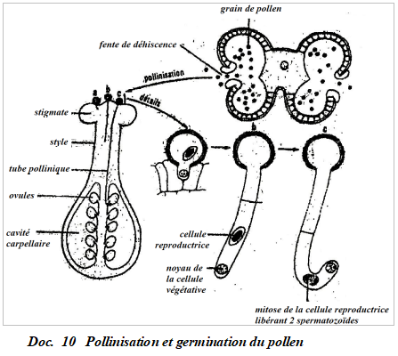 Les tubes polliniques s'insinuent entre les papilles stigmatiques et cheminent dans le stylet par la voie la plus facile et aborde l'ovule par le micropyle.